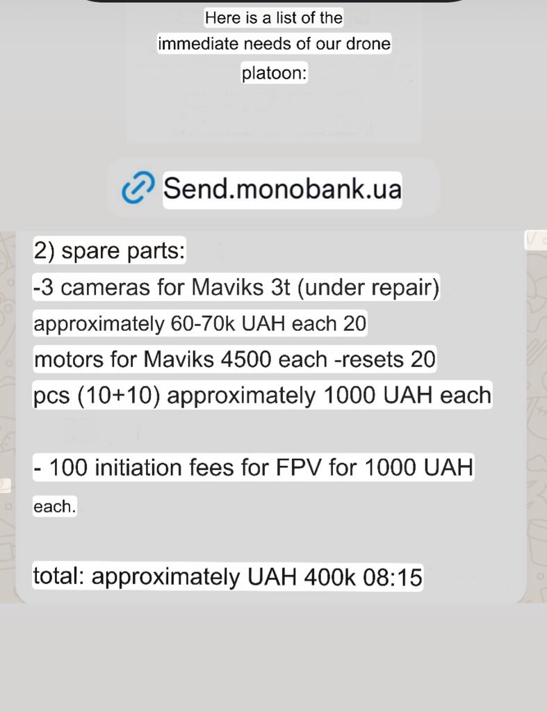 To continue their work, Andrii’s battalion urgently needs specialized equipment for their unmanned aerial vehicle (UAV) platoon, including: