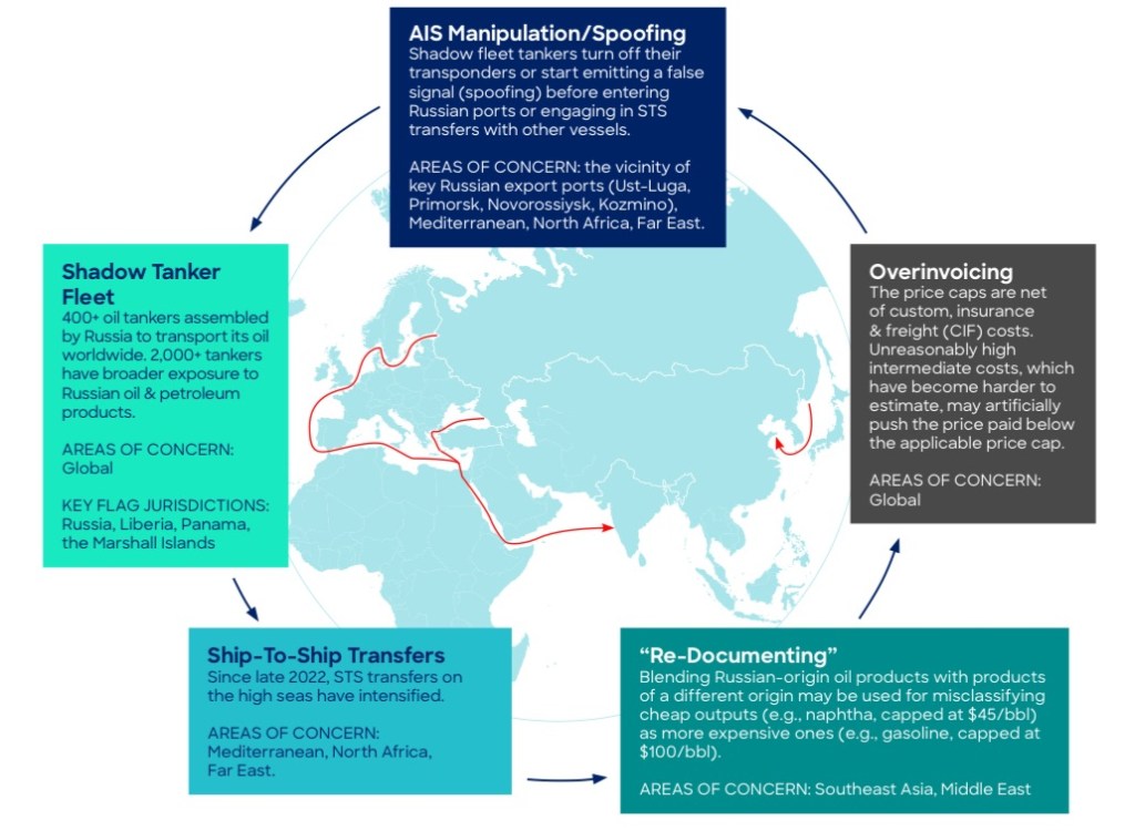 These vessels employ various methods to disguise the origin of Russian crude, including: