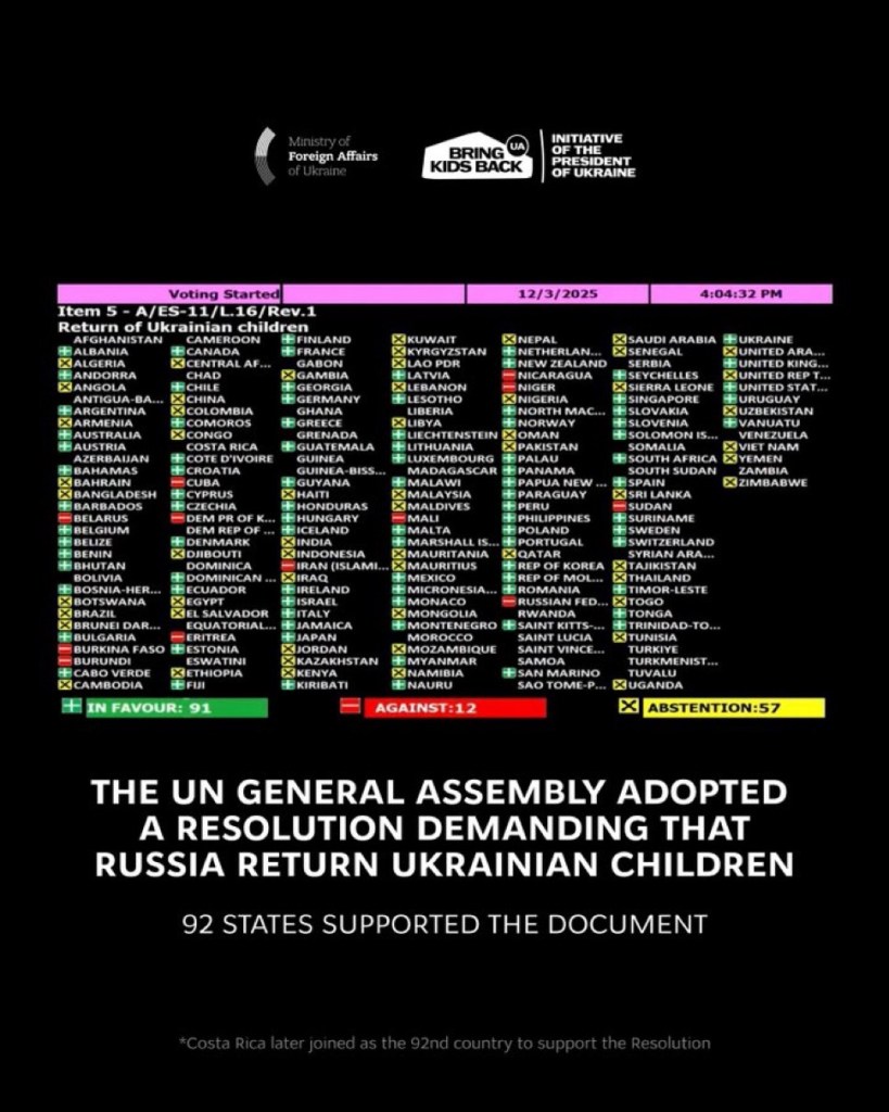 But Russia and 11 others voted against — openly opposing the return of kidnapped children.