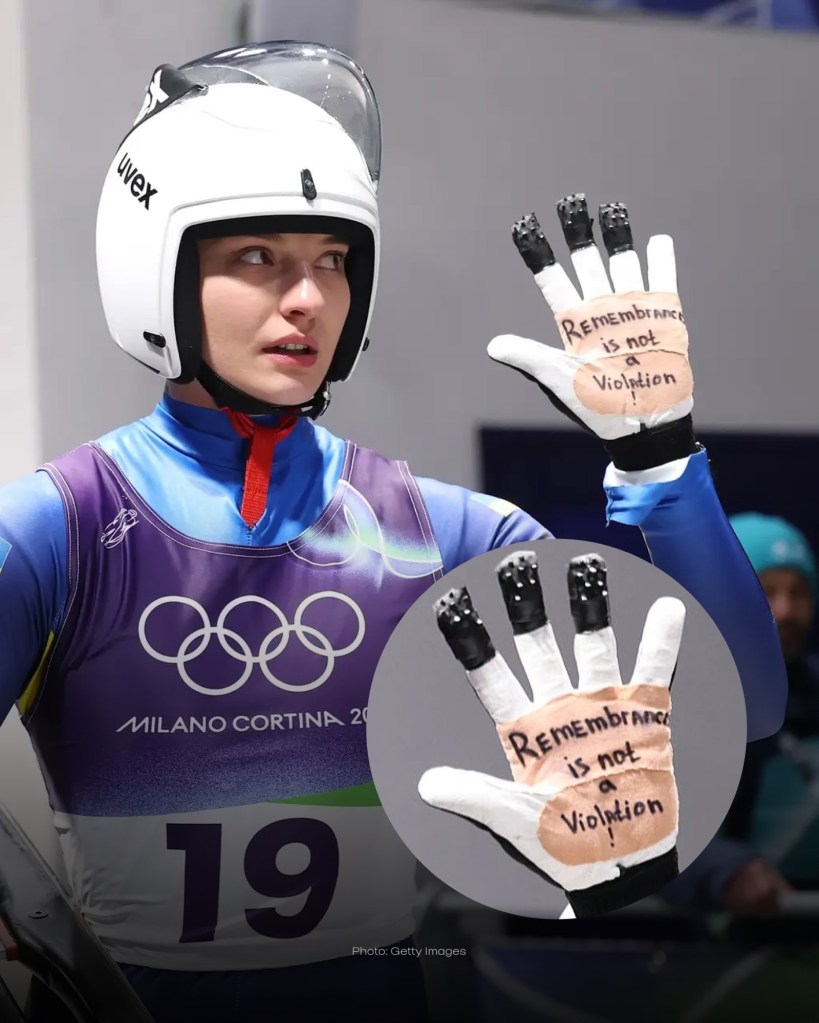 Today, Ukrainian luger Olena Smaha showed her support with words written on her gloves: